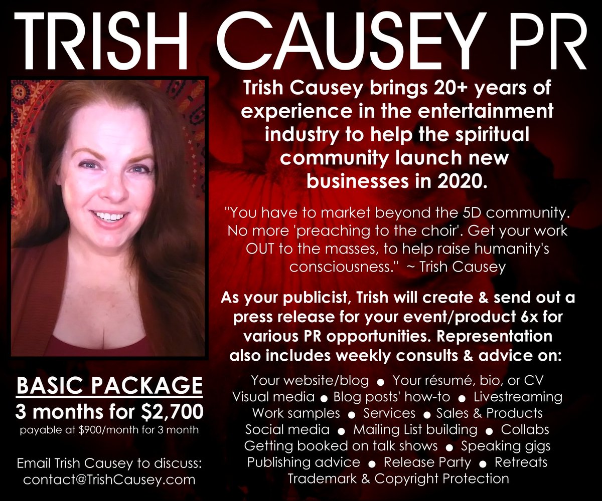 ANNOUNCING: Trish Causey PR! I bring 20+ years of experience in the entertainment industry to help the spiritual community launch new businesses in 2020. BASIC PACKAGE – 3 months for $2700. Email: contact@TrishCausey.com