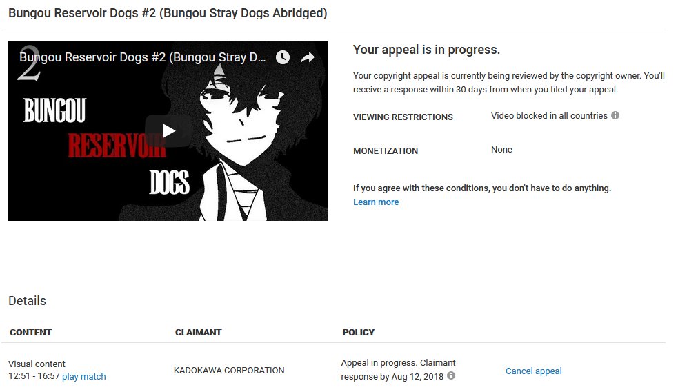 Y'all still asking where the next Bungou is? Well ask @YouTube @TeamYouTube with their new copyright rules.pic.twitter.com/pOyIw9sDiz