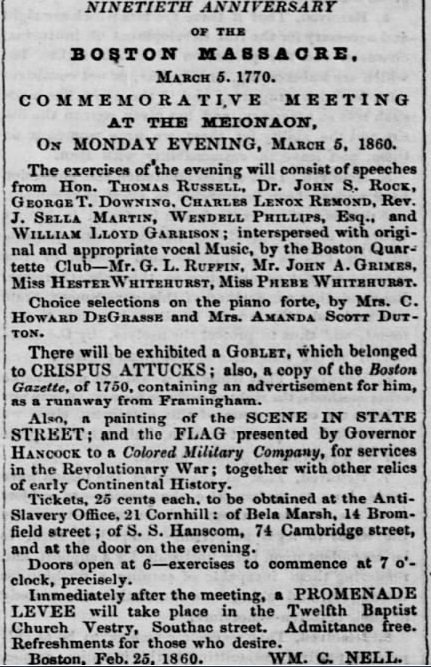 #OTD in 1770, Crispus Attucks was killed in the Boston Massacre. This “The Liberator” column advertises a commemorative meeting on the 90th anniversary of the event. On display would be a goblet that belonged to Attucks.pic.twitter.com/NqkZjeYIxa