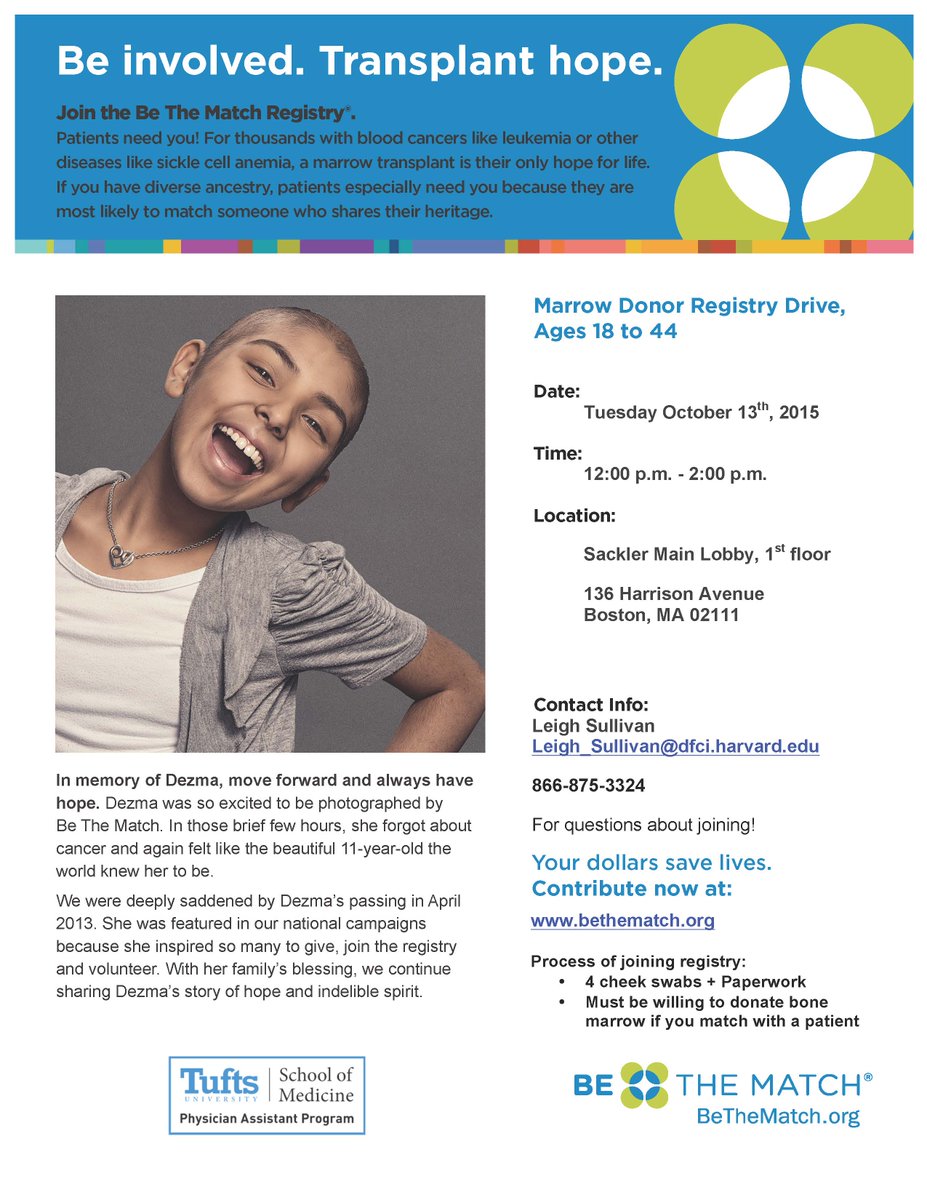 Bone Marrow Donor Registry Drive on 10/13 from 12-2PM in the Sackler Lobby: http://www.bethematch.org pic.twitter.com/jVQvwEy4dq