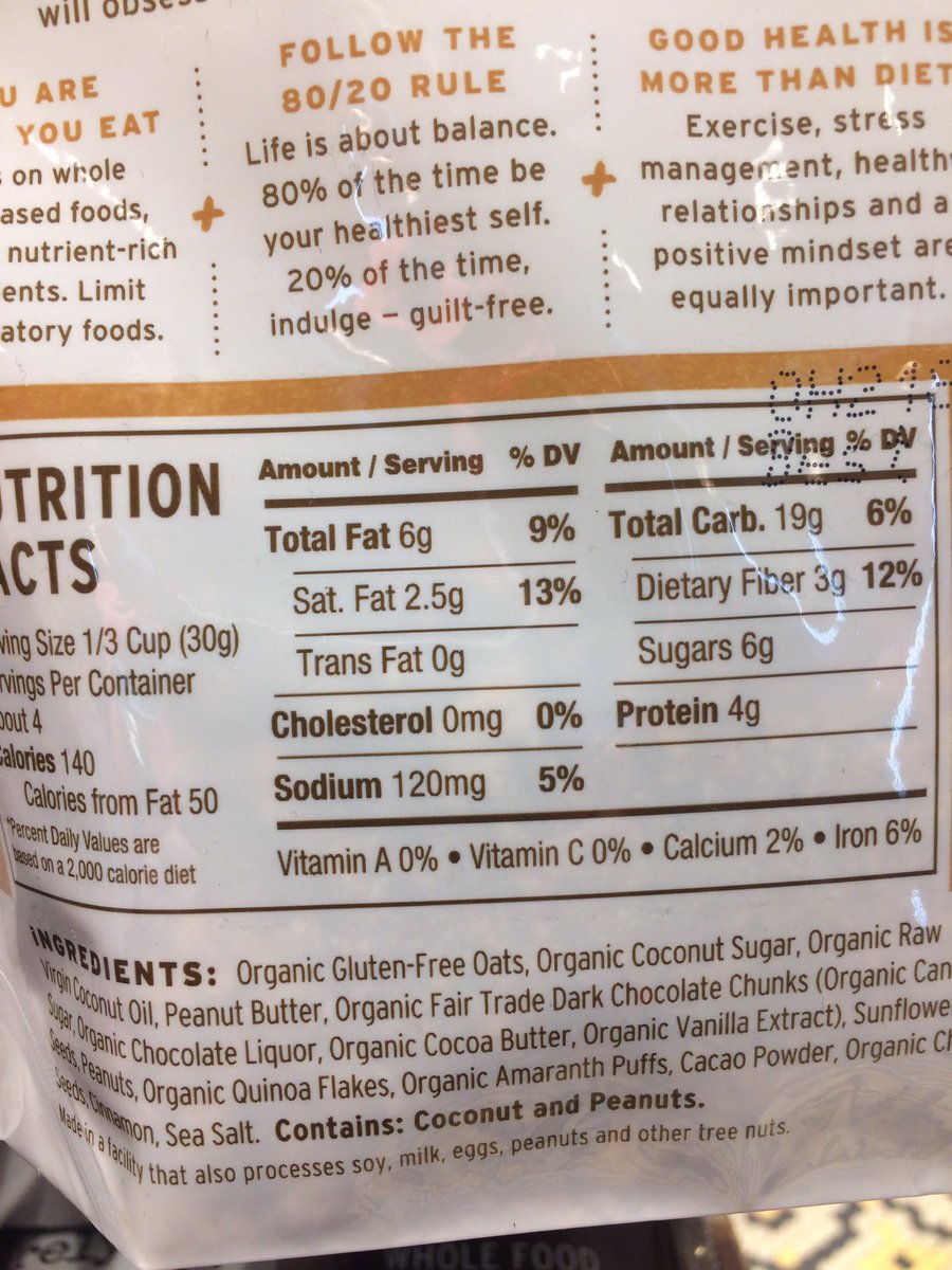 Same here. 6g “sugar” per whopping 30g serving, but 19g total carbs. 4 servings per bag again. Ingredients include oats, coconut sugar, quinoa flakes, amaranth puffs. Low-ish in sugar means almost nothing if you do best with low *total carbs.* Always read ingredient lists!pic.twitter.com/7sSqNp7IF2