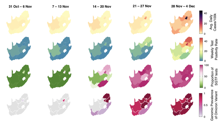 Omicron spread fast in South Africa and in four weeks went from <1% to close to 100% of infections. Figure 1C - Weekly progression of average daily cases per 100,000, test positivity rates, proportion of SGTF, and genomic prevalence of Omicron in nine provinces of South Africapic.twitter.com/h1mCrpoZP1