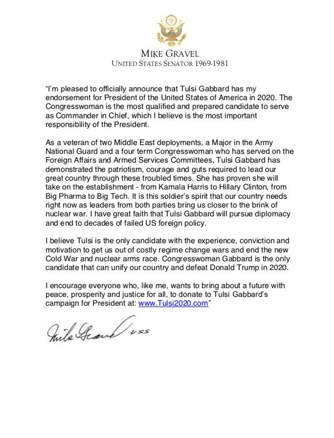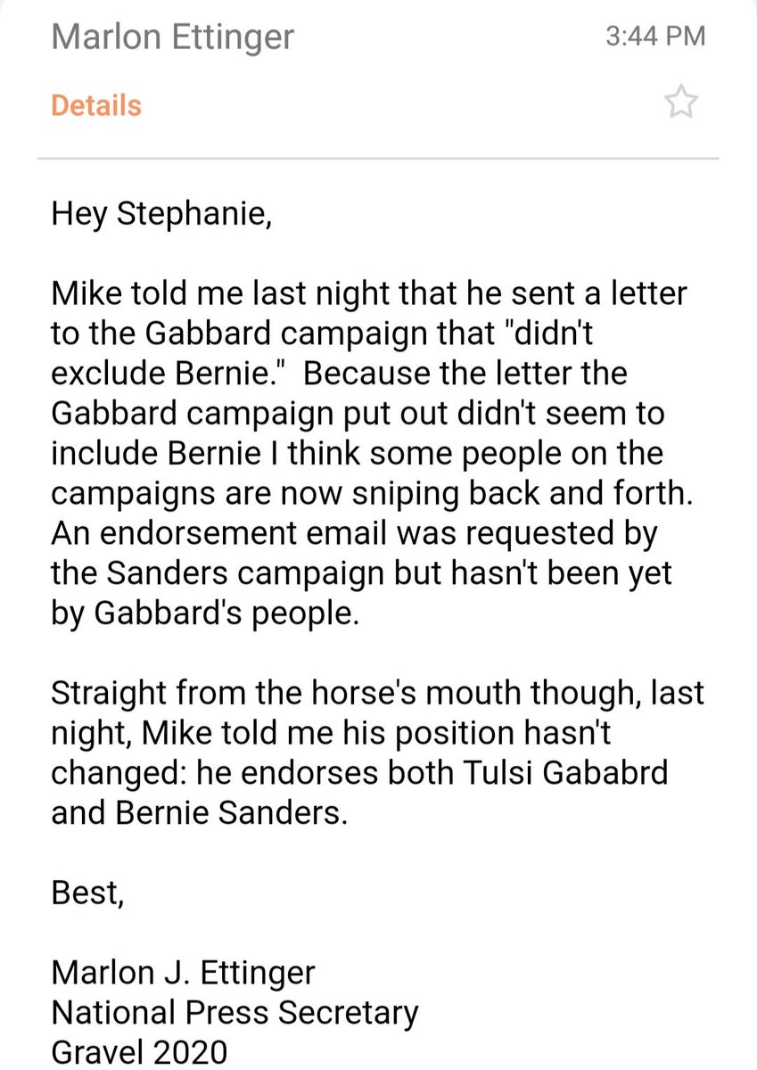 Very disappointed in the Gravel teens for not posting the video of him endorsing Tulsi too. From the beginning he’s stated how he’s impressed with Bernie & Tulsi and would endorse them both. They need to stop playing favorites and having biases.
