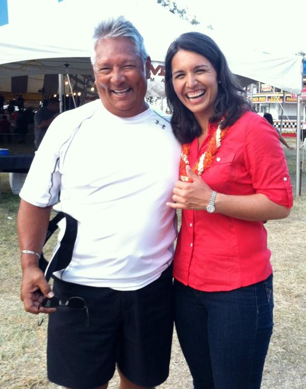 Shared some laughs with legendary coach and OHA candidate Cal Lee in Waimanalo #votetulsi #hi02pic.twitter.com/h1Ofb70J