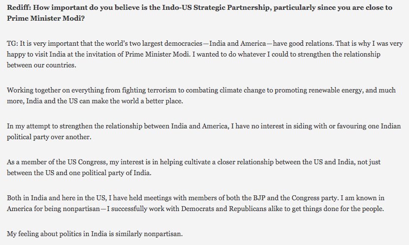 Bullshit. Tulsi is one of 32 Congresspersons who signed the letter to SoS Tillerson supportive of Issa Amro. http://mondoweiss.net/2017/06/condemn-follower-movement/ … Tulsi's on the Foreign Affairs committee. She & 99.99% of Congress support closer US ties to India, not closer ties to political parties in India.pic.twitter.com/ZVBLJSKp1O