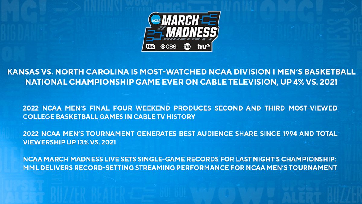 @KUHoops vs.@UNC_Basketball is most-watched NCAA Division I Men’s Basketball National Championship Game ever on cable television, up 4% vs. 2021pic.twitter.com/dGfqmVAjvr
