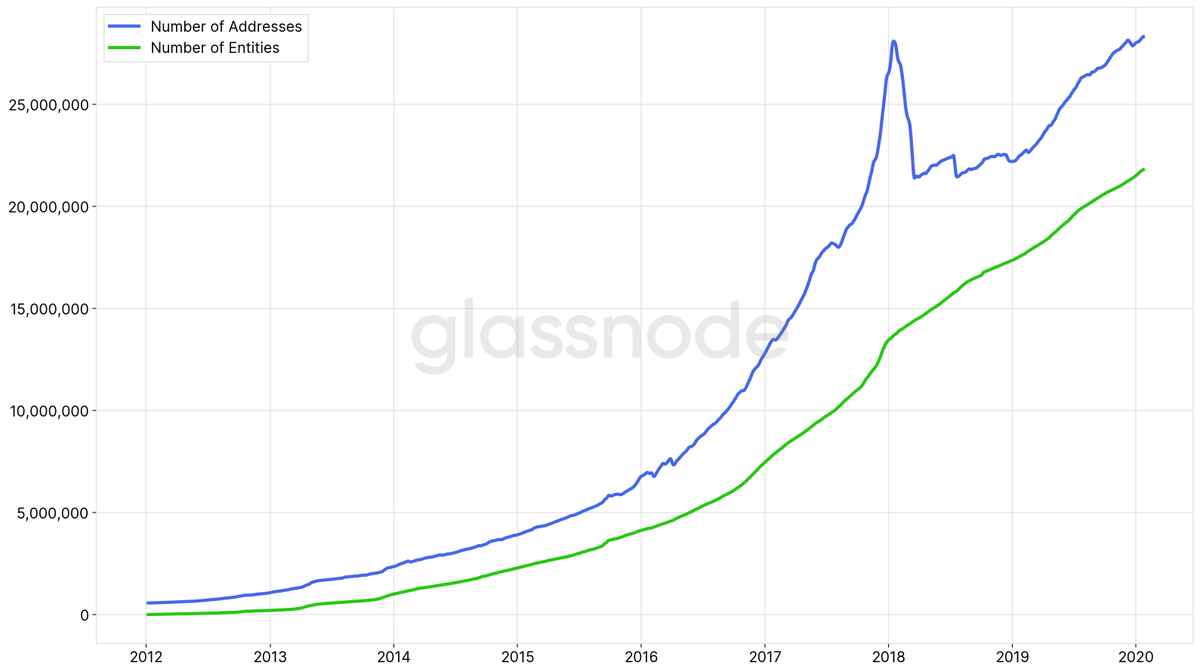 Actually the numbers in the tweet are not quoted quite correctly – those seem to be referring to the number of addresses rather than entities. Entity net growth is consistent and significant, also within the last two years. Chart from the article: https://medium.com/glassnode-insights/how-many-entities-hold-bitcoin-e945ecc5d0a1 …pic.twitter.com/2tqO90k27t