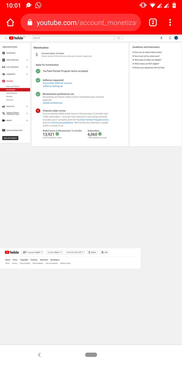 Hmm, you can also check your Monetization page in Creator Studio: https://www.youtube.com/account_monetization …. Hope this helps.