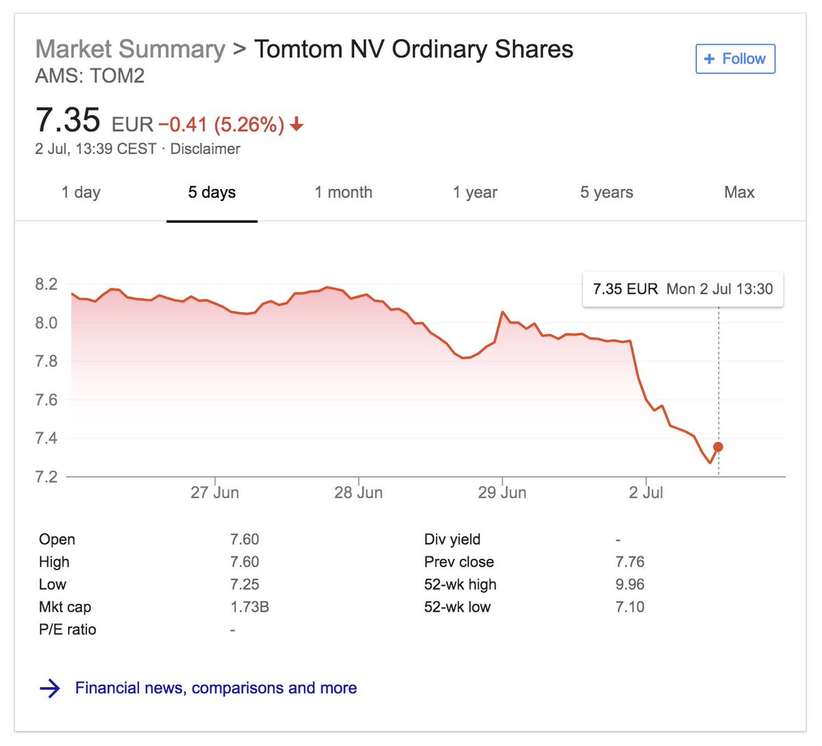 Given that TomTom was the main supplier of map data to Apple, you can see the moment Apple made their recent mapping announcements in TomTom's share price.pic.twitter.com/cAkGxJ7kq2