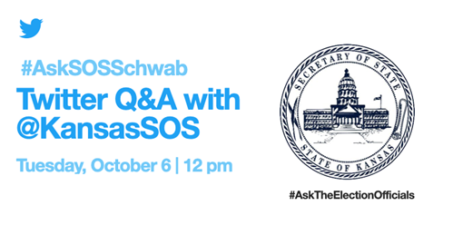 Do you have questions about voting in Kansas? Our office will be participating in a nationwide #AskTheElectionOfficials Twitter Q&A on Tuesday, October 6 at 12 p.m. CT. We'll answer as many questions as we can! Reply or Tweet your question with #AskSOSSchwab! pic.twitter.com/P3dtABPkbl