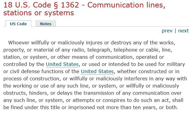 Salut, but my dude best watch out, might be open to federal prosecution under 18 U.S.C. § 1362: ~"willfully interfering with the…use of any…means of communication…intended to be used for military or civil defense functions of the United States", etc https://twitter.com/TwitterGov/status/926267806261407744 …pic.twitter.com/n7Q7qecqZZ