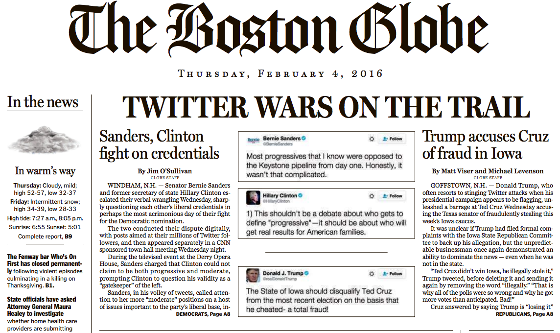 .@BostonGlobe fronts candidates' Tweets to capture real-time #FITN #NHPrimary campaign.pic.twitter.com/76KWUDVFDf