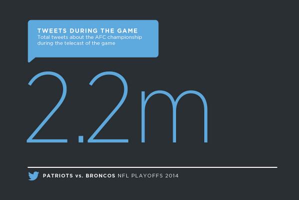 “@TwitterSports: There were 2.2m Tweets during the @Patriots v @Broncos #nflplayoffs game pic.twitter.com/raAu11zCao”@brandonbeeken WayIn opp