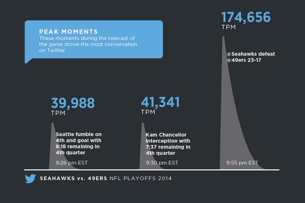 “@TwitterSports: Check out the huge Tweet-per-minute peaks of the @49ers v @Seahawks #nflplayoffs game pic.twitter.com/2Y3OWhBvuZ”
