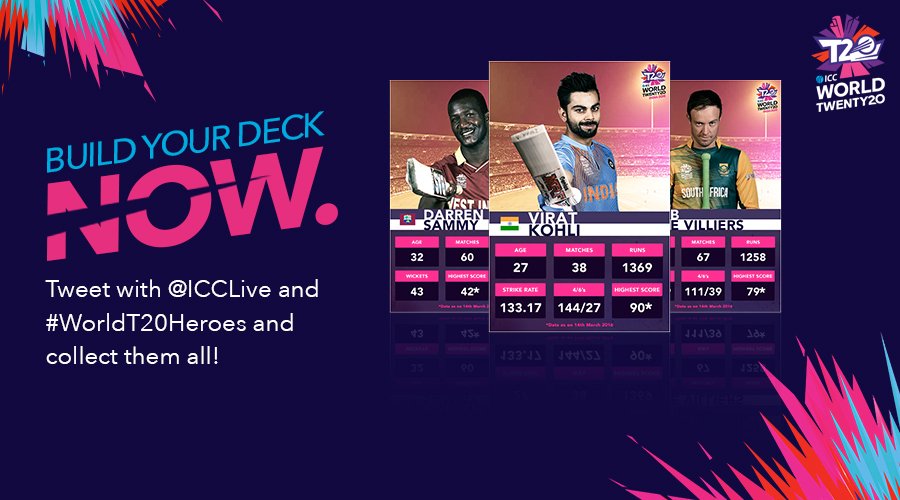 LAUNCHING NOW: Collect your favourite #WorldT20Heroes by tweeting @ICCLive with #WorldT20Heroes NOW! #WT20 pic.twitter.com/tFyNH7qFRj