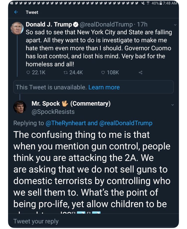 My Tweet to Trump vanished on his timeline, but could be seen on mine... ‘This tweet is unavailable. Learn more’ Some replies to my tweet could be seen.pic.twitter.com/NDAqnK9xSV