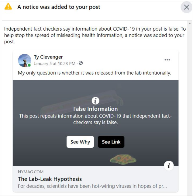 @NYMag is a liberal publication, but it ran@nicholsonbaker8 article questioning whether COVID came from a lab. Oligarch Zuckerburg does not approve! Will Oligarch@Jack Dorsey follow?pic.twitter.com/AzgXLKbgLI