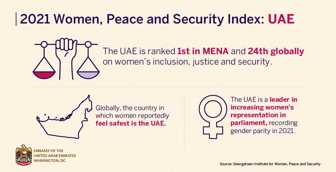 @giwps &@prioGPS’s Women, Peace & Security index, which measures women’s level of inclusion, justice and security in society. Learn more about the UAE’s impressive progress towards gender equity: https://bit.ly/GUWPS2021 pic.twitter.com/LXkjiRmIuU