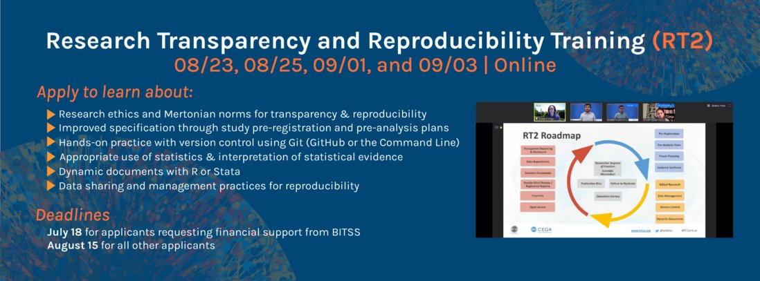 Applications are now open for the next Research Transparency and Reproducibility Training (#RT2virtual) on 08/23, 08/25, 09/01, 09/03.