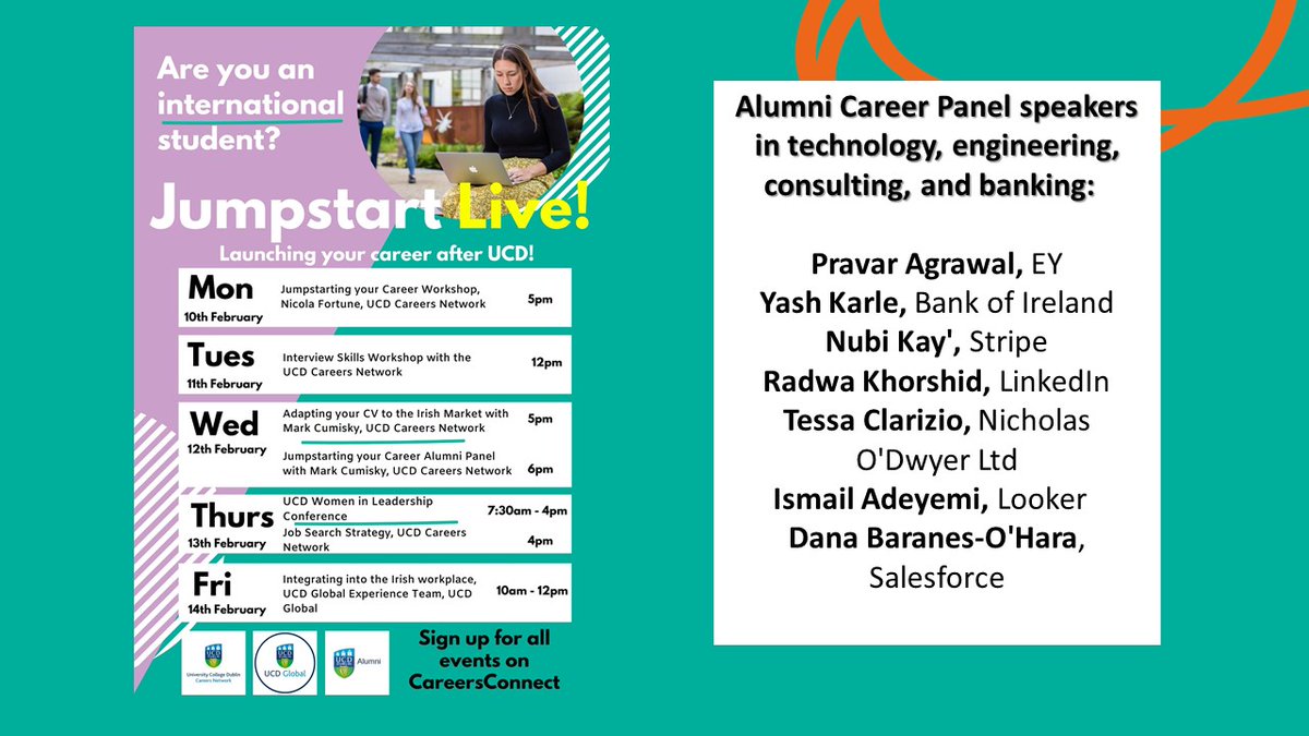 Announcing the Jumpstart Live Alumni Panel with speakers in Technology, Engineering, Consulting and Banking. Signup and find all the event details on CareersConnect: https://buff.ly/37XeKYj