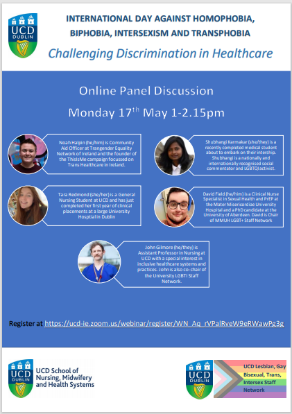 #IDAHOBIT, we would like to invite you to a webinar on Challenging Discrimination in Healthcare. The webinar will take place on Monday, 17 May from 1-2.15pm. Please register https://ucd-ie.zoom.us/webinar/register/WN_Aq_rVPalRveW9eRWawPg3g …pic.twitter.com/wEXULmUObw