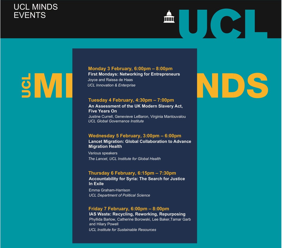 Here's some free @UCL events to look forward to! Mon: https://www.eventbrite.co.uk/e/first-mondays-joyce-and-raissa-de-haas-founders-double-dutch-registration-86126630069 … Tue: https://www.eventbrite.co.uk/e/an-assessment-of-the-uk-modern-slavery-act-five-years-on-tickets-85227003261 … Wed: https://www.eventbrite.co.uk/e/lancet-migration-global-collaboration-to-advance-migration-health-tickets-86910895829 … Thu: https://www.eventbrite.co.uk/e/accountability-for-syria-the-search-for-justice-in-exile-tickets-85614131171 … Fri: https://www.eventbrite.co.uk/e/ias-waste-recycling-reworking-repurposing-art-and-the-aesthetics-of-waste-tickets-74094940963 …#UCLMinds#EventsLondonpic.twitter.com/dRPuo1GQ1g