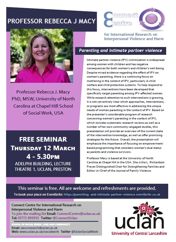 #research seminar@UCLanSocialWork on 12 March at 4pm by Prof R Macy@UNC_SSW - 'Parenting and#IntimatePartnerViolence'#IPV - focussing on empowerment-based programming that considers women’s dual status as parents and#violence survivors. Book here http://bit.ly/31qbZw3 pic.twitter.com/5f4YK67pzj