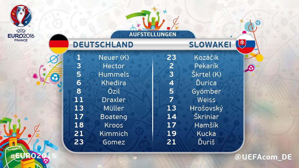 Das sind die Aufstellungen von #GER und #SVK! #GERSVK #EURO2016pic.twitter.com/ciM5fNKXoJ