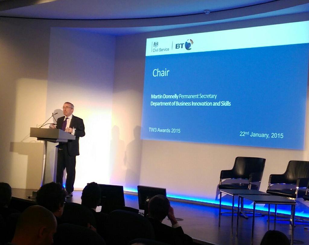 Hearing now from @MDonnellyBIS - Chair of #SmartWorking and Permanent Secretary at @bisgovuk #TW3 #TW3Awardspic.twitter.com/9OZb2HZXdb
