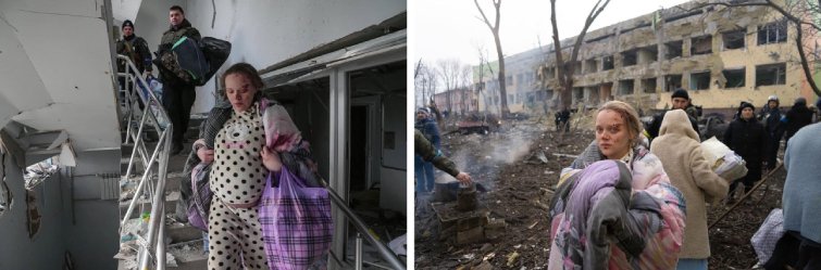 A pregnant woman pictured being evacuated from a bombed maternity hospital in