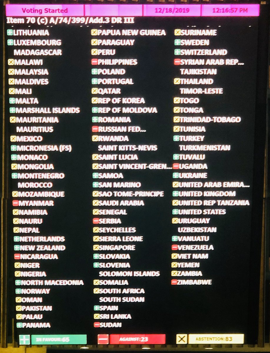 Генеральная Ассамблея ООН приняла резолюцию о защите прав человека в оккупированном Россией Крыму За новую резолюцию проголосовало 65 стран, против – 23, воздержались – 83. https://crimeahrg.org/ru/13759-2/