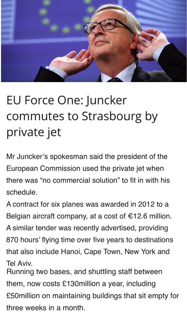 Jean-Claude Juncker flies the 220 mile journey between Brussels and Strasbourg by private jet, records show. pic.twitter.com/piczfL4o6T