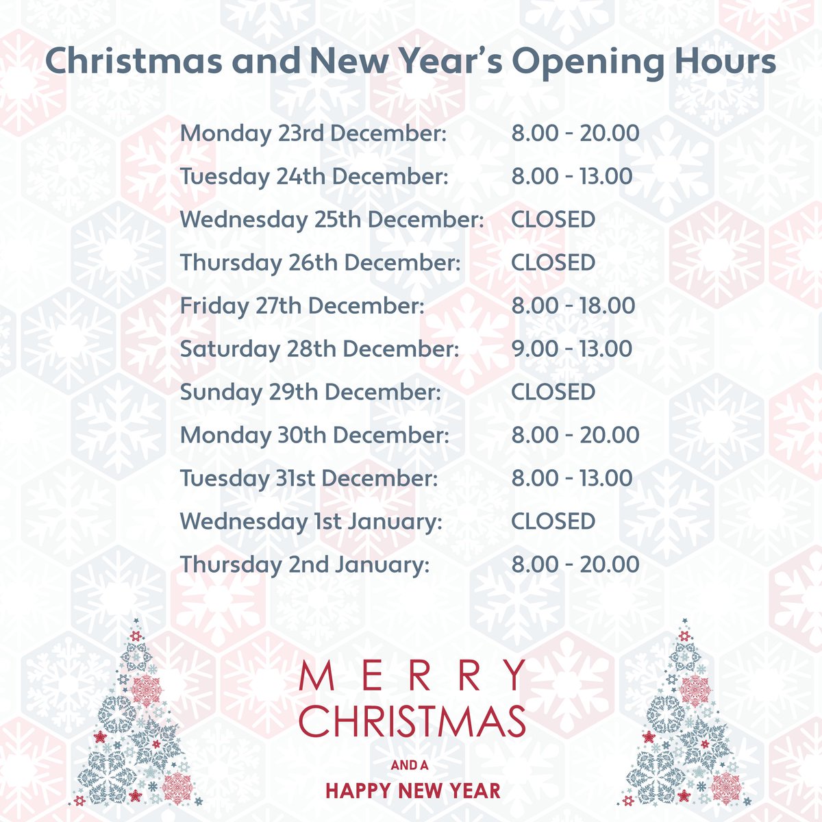 Just in case we had some of your wondering… Here are our Christmas & New Year’s Opening Times