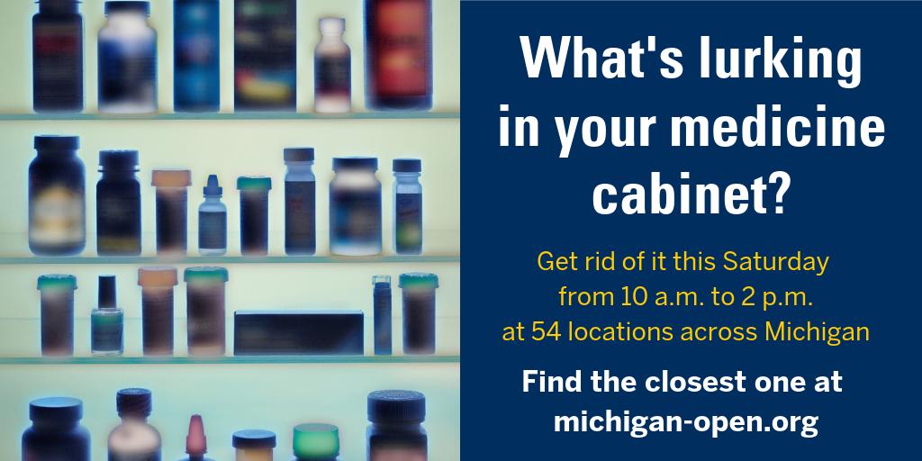 On April 27, Michigan residents in 34 counties can dispose of unused & expired medications from 10am to 2pm This statewide effort is made possible through local partnerships with U-M’s Michigan Opioid Prescribing Engagement Network (M-OPEN) http://myumi.ch/6k1Qk