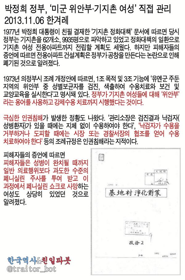 @UN@GH_PARK 박정희정부 외화 벌기 위해 미군위안부와 기지촌여성을 직접관리,‘위안부’용어를 사용하고 강제수용치료를 시행.치료 중 쇼크로 사망하는 여성도 많았다. http://bit.ly/1cdpf7Q pic.twitter.com/ffkvbDzUSo
