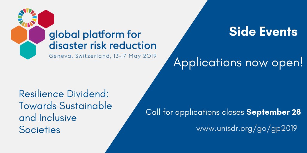 Side events are always one of the most popular features of the Global Platform for Disaster Risk Reduction. September 28 is the deadline for applications. So please share and don't delay! #GP2019Geneva #TheResilienceDividend #SendaiFramework http://bit.ly/2NmWlOd pic.twitter.com/xZRrNOGsmK