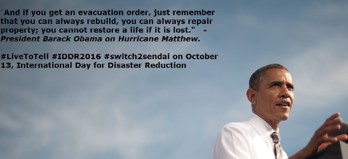 Listen to President Obama. #LiveToTell is the focus of International Day for Disaster Reduction, Oct 13. Sign up http://bit.ly/2crcEp0 pic.twitter.com/35Fmxy0r0t