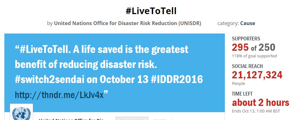 Quick! Just 2 hours left for your followers to join 21 mln making noise about saving lives in disasters http://bit.ly/2crcEp0 #LiveToTellpic.twitter.com/WcZJGOtRiw