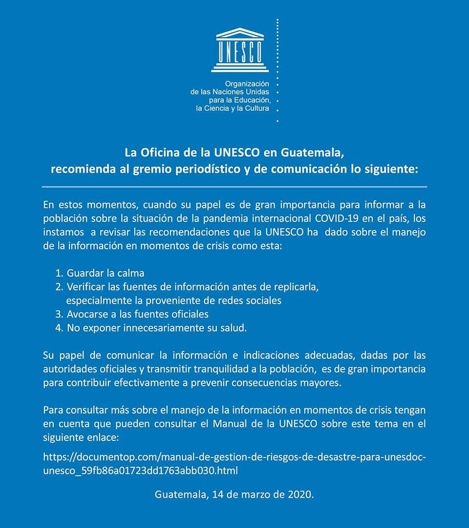 La Oficina de la @UNESCOgt, recomienda al gremio periodístico y de comunicación lo siguiente: