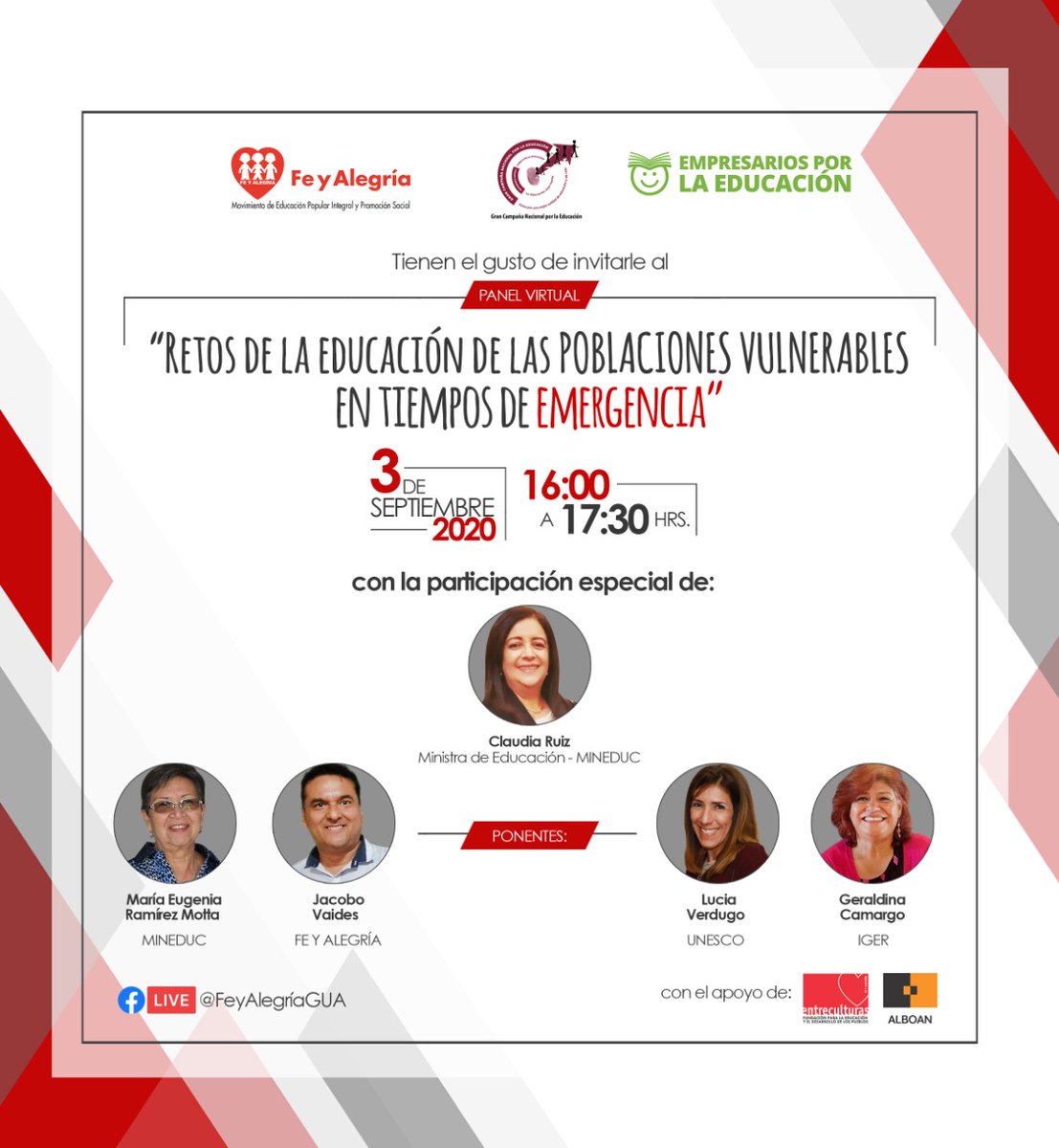 La #Educación está en emergencia. Expertos nos ayudarán a reflexionar sobre los "Retos de la Educación de las poblaciones vulnerables en tiempos de emergencia" 3 de septiembre 2020 / 16:00 horas / Facebook Live https://www.facebook.com/FeyAlegriaGUA  @GCNPEGuate @exeguatemala pic.twitter.com/u5UaeEuEFy