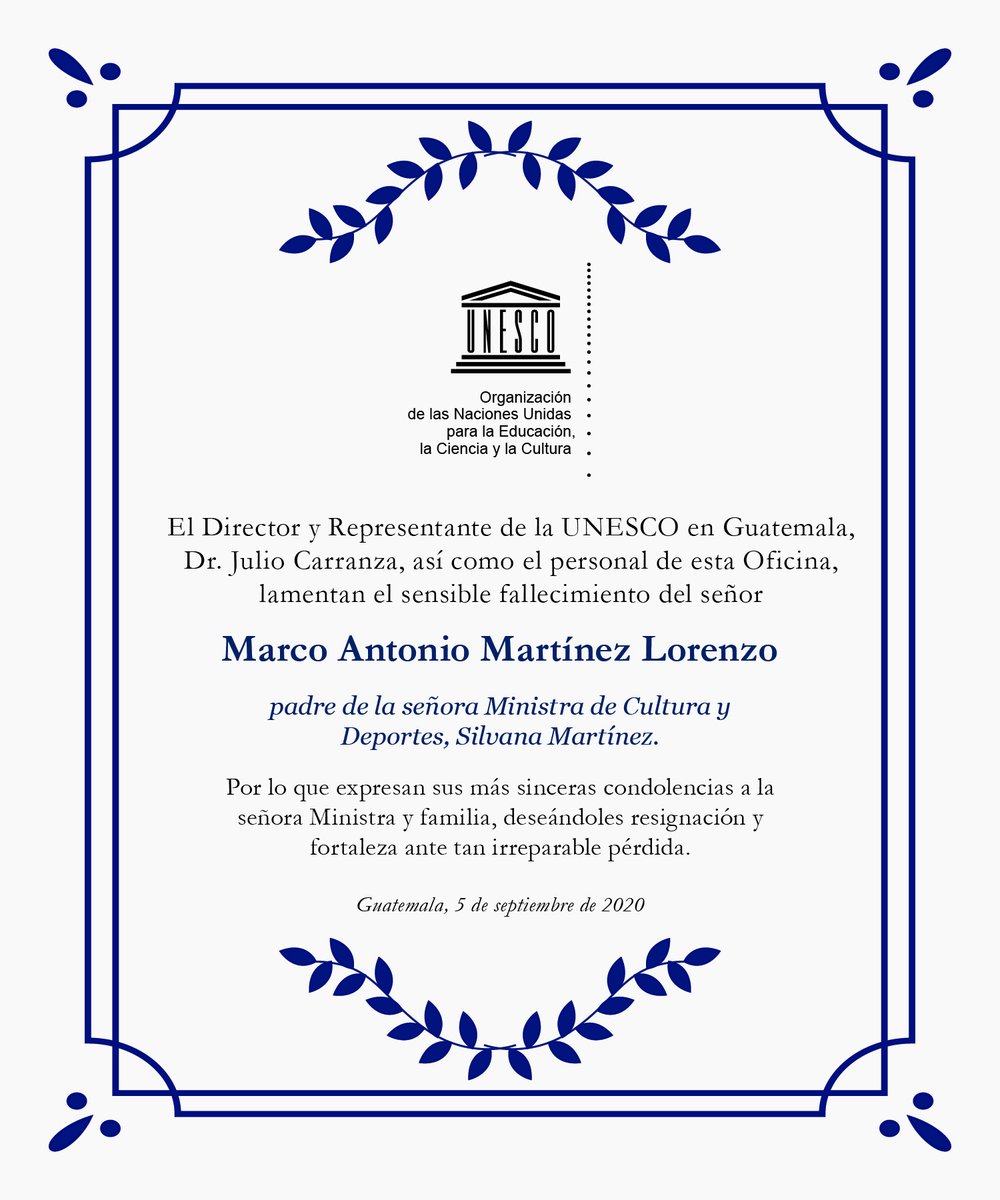 El Director y Representante de la @UNESCOgt, Dr. Julio Carranza, así como el personal de esta Oficina, lamentan el sensible fallecimiento del señor, Marco Antonio Martínez Lorenzo, padre de la señora Ministra de Cultura y Deportes,