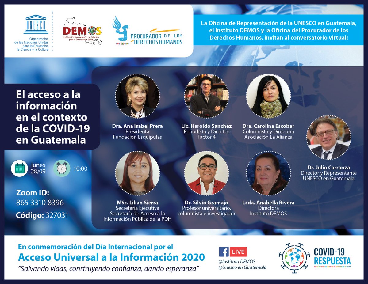La oficina de Representación de @UNESCOgt , @demos_i y @PDHgt invitan al conversatorio virtual "El acceso a la información en el contexto de la #COVID19 en Guatemala" 🗓️: Hoy ⌚️: 10:00 AM Guatemala 🔗 Fb Live @ Instituto DEMOS , @ UNESCO en Guatemala pic.twitter.com/6yT5t2G1jQ