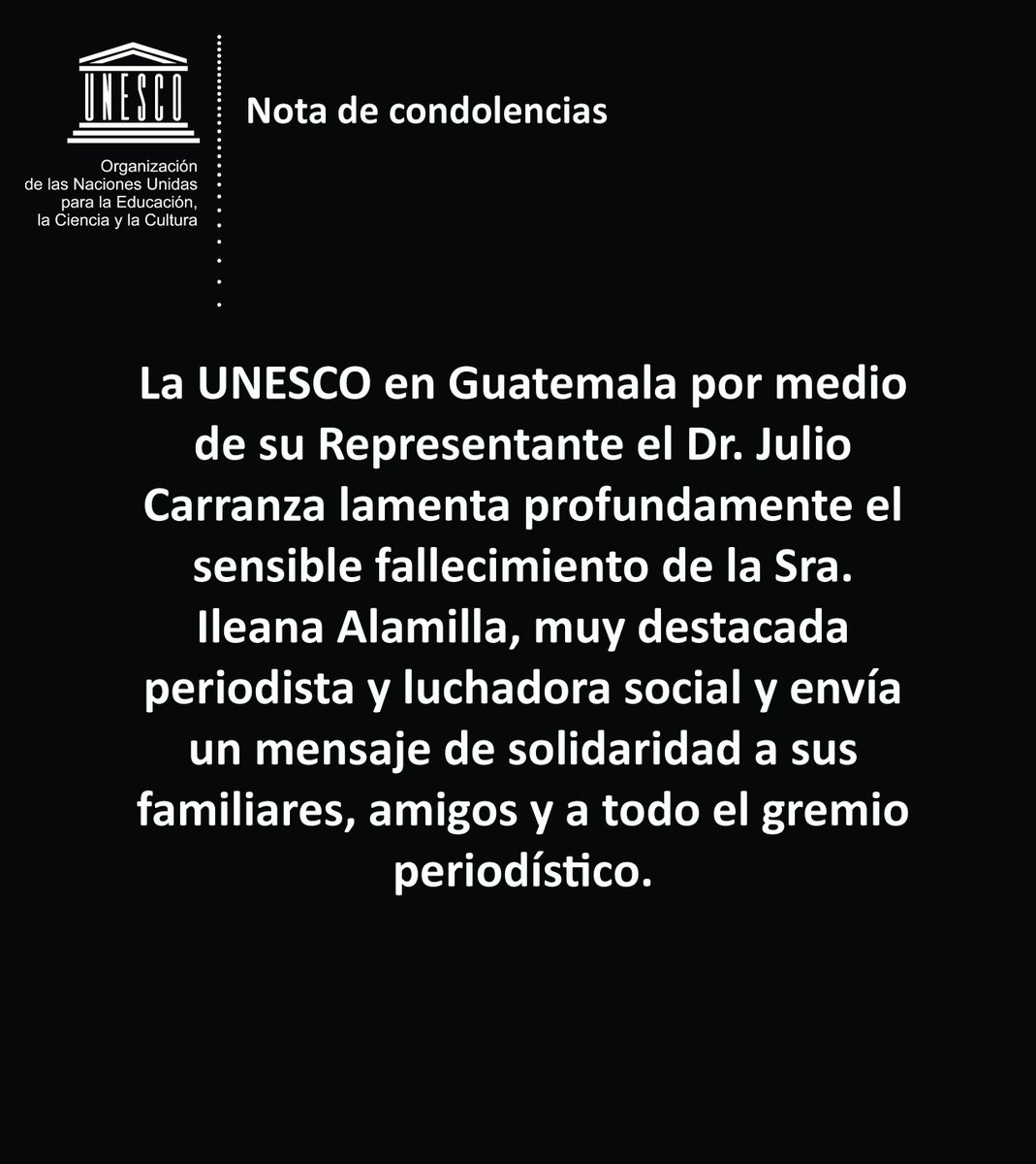 La UNESCO en Guatemala por medio de su Rep. el Dr. Julio Carranza lamenta profundamente el sensible fallecimiento de la Sra. Ileana Alamilla, muy destacada periodista y luchadora social y envía un mensaje de solidaridad a sus familiares, amigos y a todo el gremio periodístico.pic.twitter.com/4BNsHZgCsy