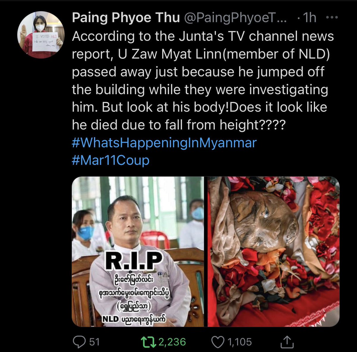 According to the Junta's TV channel news report, U Zaw Myat Linn(member of NLD) passed away just because he jumped off the building while they were investigating him. But look at his body!Does it look like he died due to fall from height????