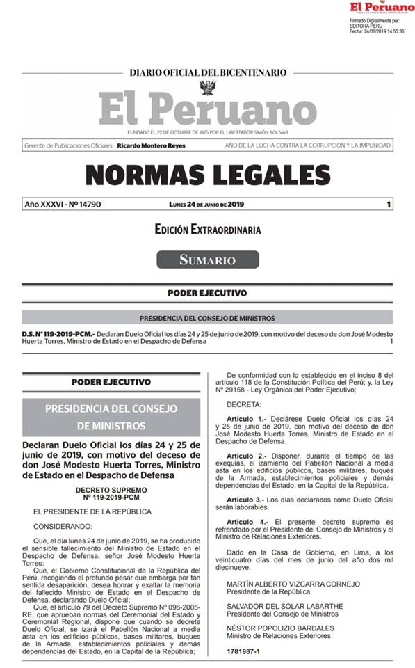 D.S. Nº 119-2019-PCM.- Declaran Duelo Oficial los días 24 y 25 de junio de 2019, con motivo del deceso del Ministro de Defensa.pic.twitter.com/LKnuT1qWDc