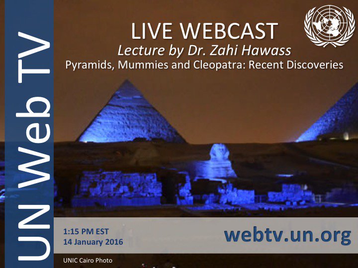 Egyptologist to deliver secrets of #Pyramids, Mummies & Cleopatra LIVE on http://webtv.un.org at 1pm @ZahiHawasspic.twitter.com/h766vaGXmE