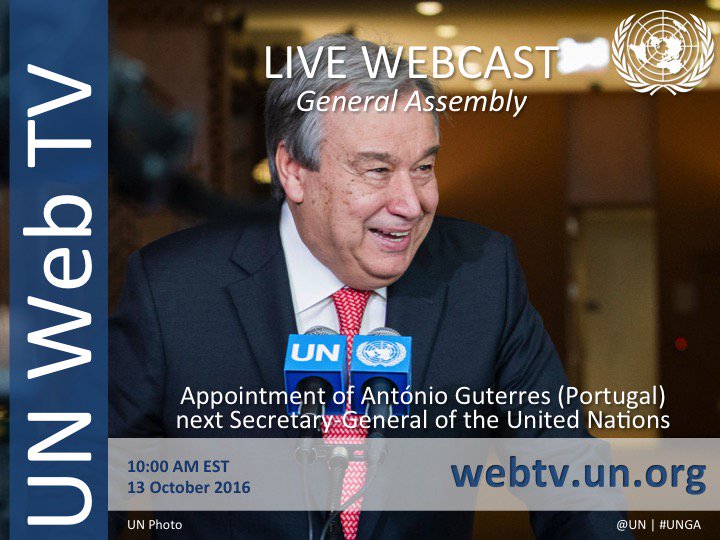 .@UN Member States set to appoint next Secretary-General this morning! Watch LIVE in 6 languages | 10:00am EST http://webtv.un.org pic.twitter.com/1oRhGb2h9k