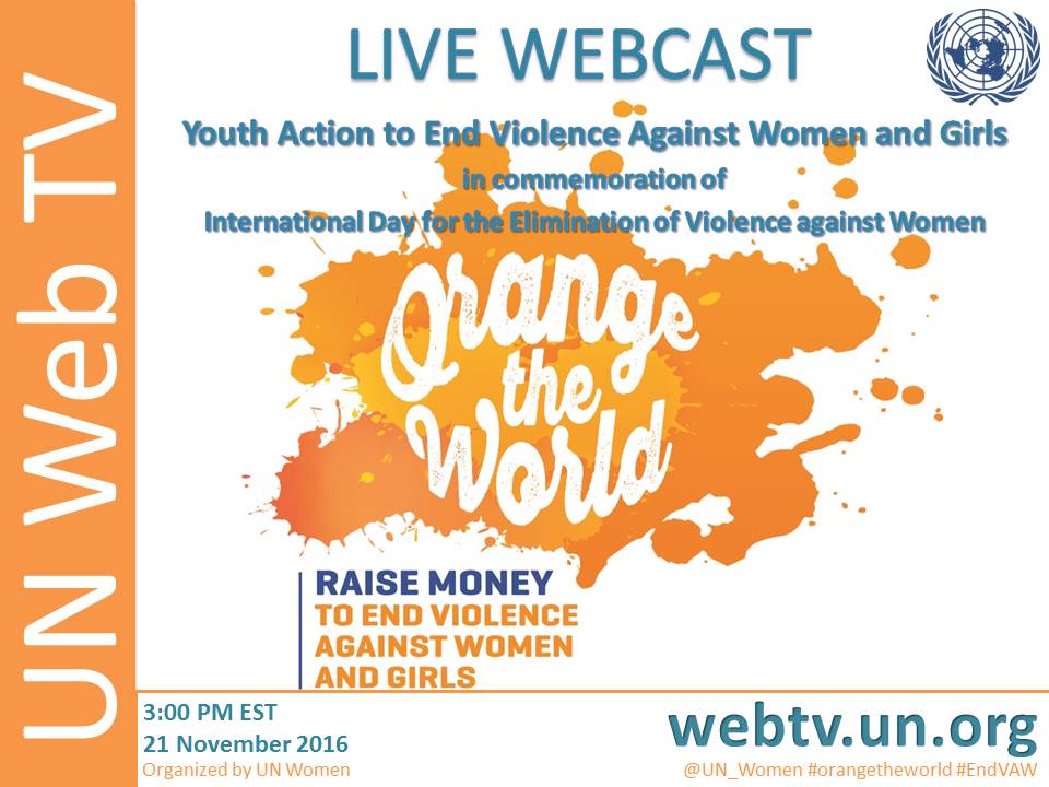 "Youth Action to End Violence Against Women & Girls" for Int'l Day to #EndVAW #orangetheworld Watch LIVE 3PM today → http://webtv.un.org pic.twitter.com/VkM6mql825