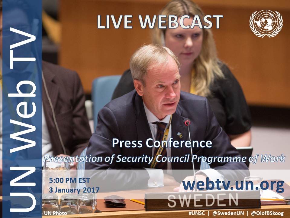 #Sweden takes #UNSC presidency for Jan. 2017. Watch Ambassador @OlofBSkoog present the priorities at 5PM EST, 3 Jan.→http://webtv.un.org pic.twitter.com/N7DKK3Ep6B