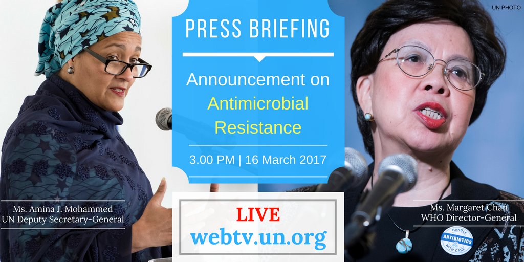 #AntimicrobialResistance announcement by @UN @AminaJMohammed & @WHO Margaret Chan Watch Press Briefing LIVE 3PM NY 📺 http://webtv.un.org pic.twitter.com/9DEg92UOa0